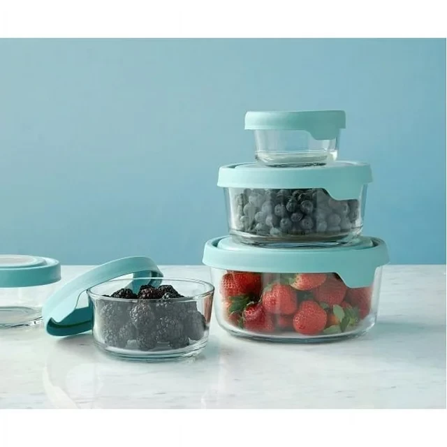 Set Contains: (1) 2 Cups, (1) 4 Cups, (1) 7 Cups Round Glass Food Storage Containers with Mineral Blue True Seal Lids Anchor Hocking designed the True Seal Glass Food Storage products to prevent spills and leaks by utilizing the textured lid, which seamlessly forms to the glass container. The airtight seal ensures that transporting and keeping food fresh has never been safer or easier. The lids are tougher than ever, easy to date with dry-erase markers, and top-rack dishwasher safe. True Seal Glass makes carrying food to work, keeping it in the fridge, microwave-reheating it in a pinch, and saving space at home easier than ever.