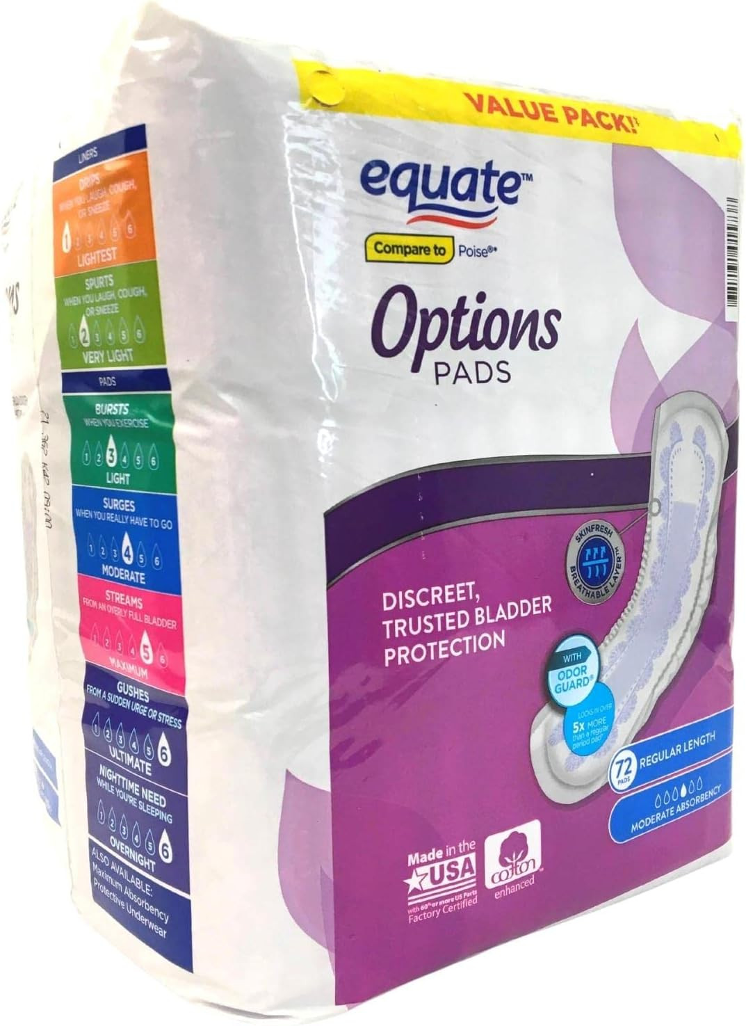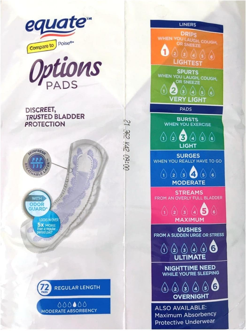 Equate Options Incontinence Pads Regular Length Bundle | Includes 72 Equate Options for Women, Moderate Absorbency | Plus Travel Wet Wipes!