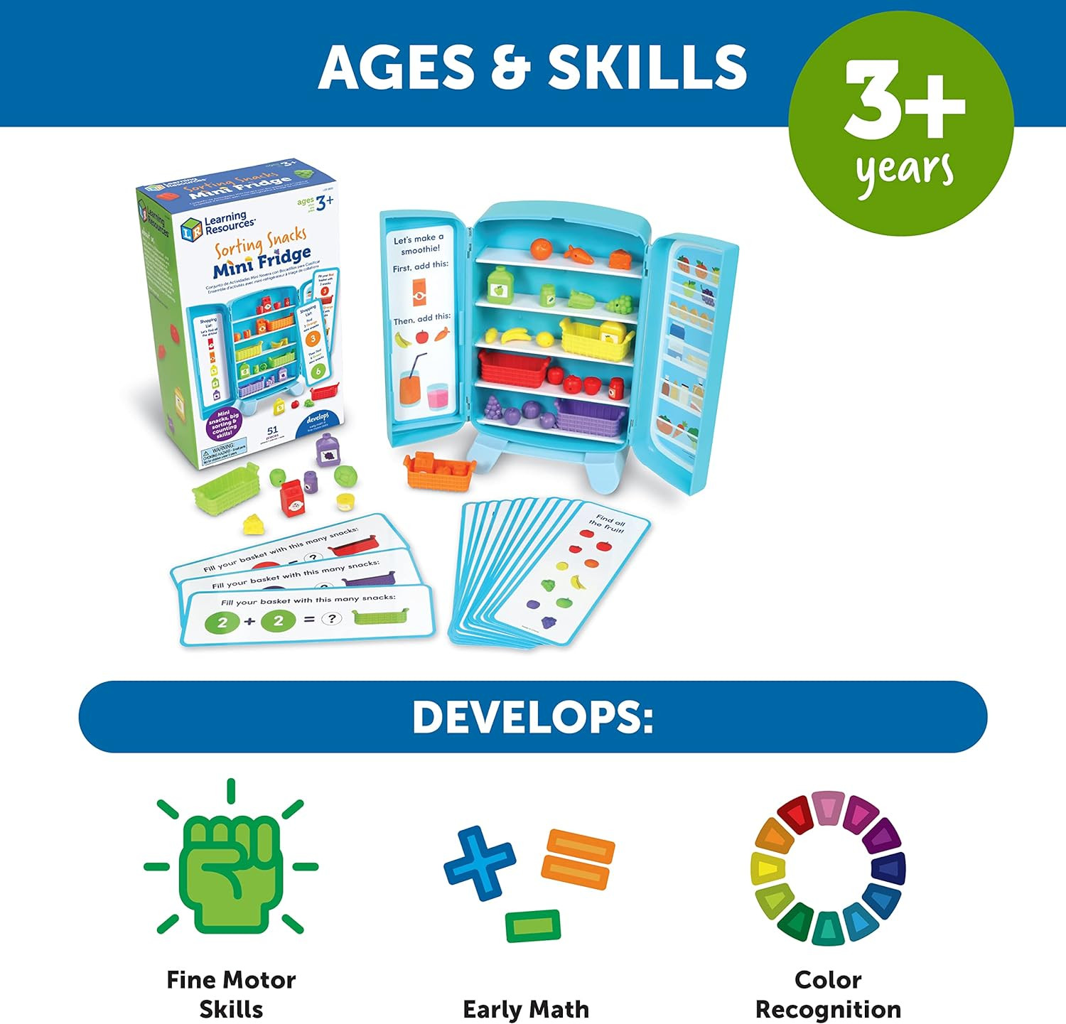 Mini Fridge, Big Skills: Kids master counting, sorting, and patterning as they explore this toddler learning toy’s 30 colorful mini snacks and 15 double-sided activity cards!
