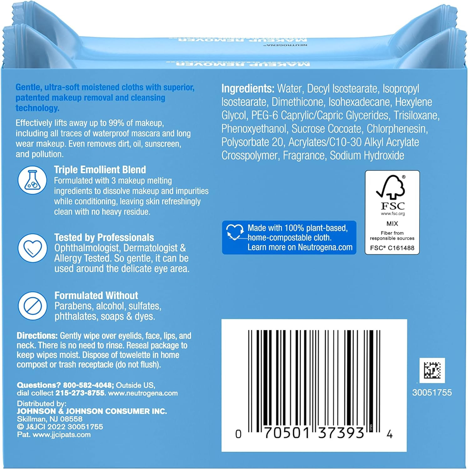 Neutrogena Cleansing Fragrance Free Makeup Remover Face Wipes, Cleansing Facial Towelettes for Waterproof Makeup, Alcohol-Free, Unscented, 100% Plant-Based Fibers, Twin Pack, 2 x 25 ct