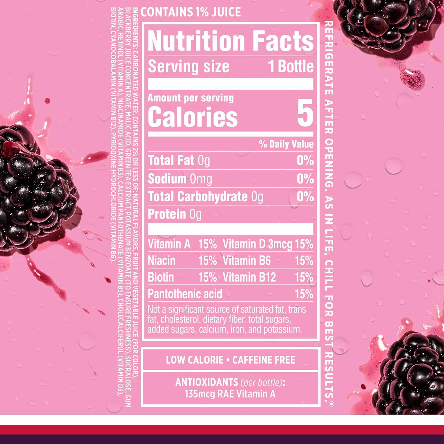 INGREDIENTS: CARBONATED WATER, NATURAL FLAVORS, MALIC ACID, VEGETABLE JUICE (FOR COLOR), BLACKBERRY JUICE CONCENTRATE, POTASSIUM BENZOATE (TO ENSURE FRESHNESS), SUCRALOSE, GUM ARABIC, GREEN TEA EXTRACT, RETINOL (VITAMIN A), NIACINAMIDE (VITAMIN B3), CALCIUM PANTOTHENATE (VITAMIN B5), CHOLECALCIFEROL (VITAMIN D3), BIOTIN, CYANOCOBALAMIN (VITAMIN B12), PYRIDOXINE HYDROCHLORIDE (VITAMIN B6)