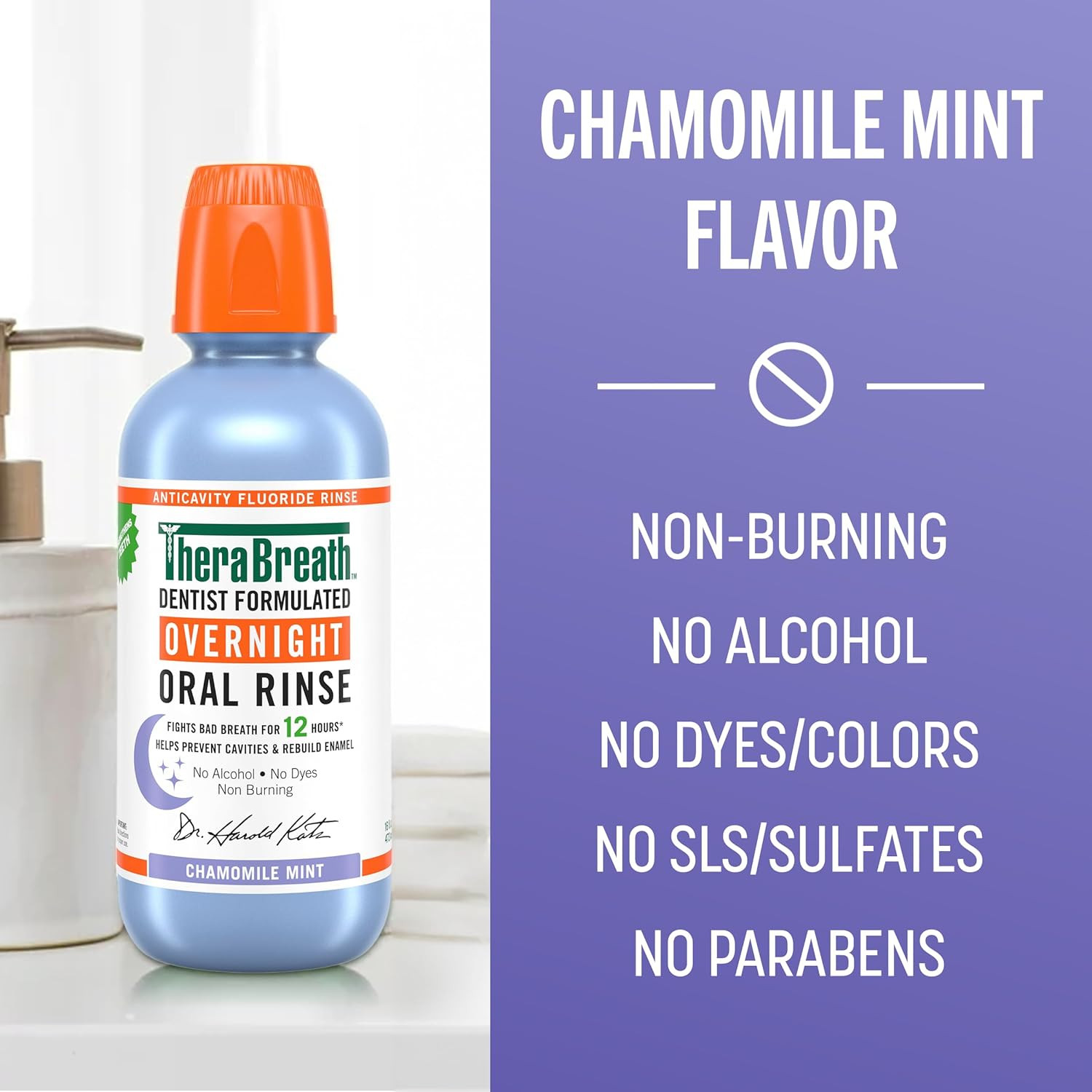 TheraBreath Overnight Mouthwash, Fights Bad Breath for 12 Hours, Chamomile Mint Flavor, Dentist Formulated, Fluoride Rinse, Alcohol Free, 16 fl oz (Pack of 2)