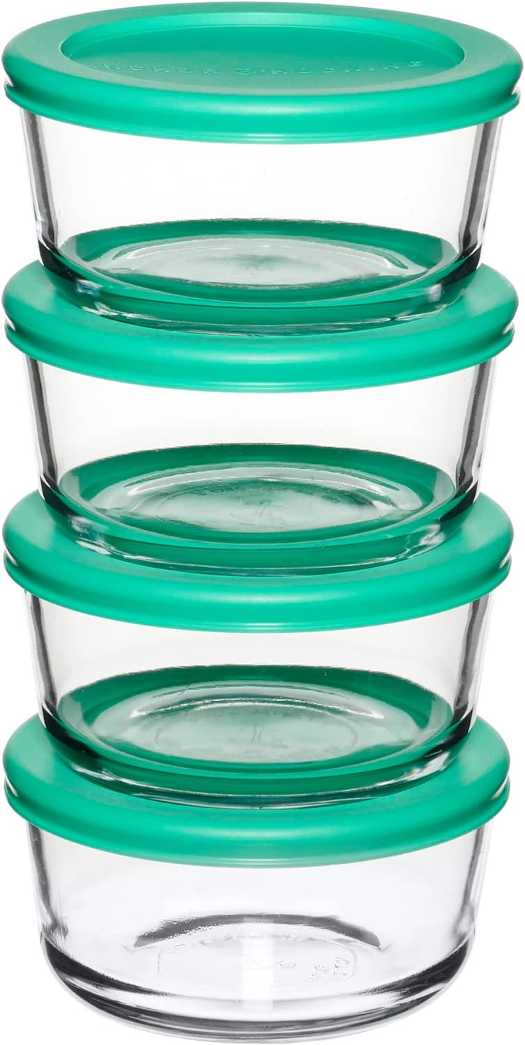 Anchor Hocking 2 Cup Glass Storage Containers with Lids, Set of 4 Glass Food Storage Containers with Mint SnugFit Lids