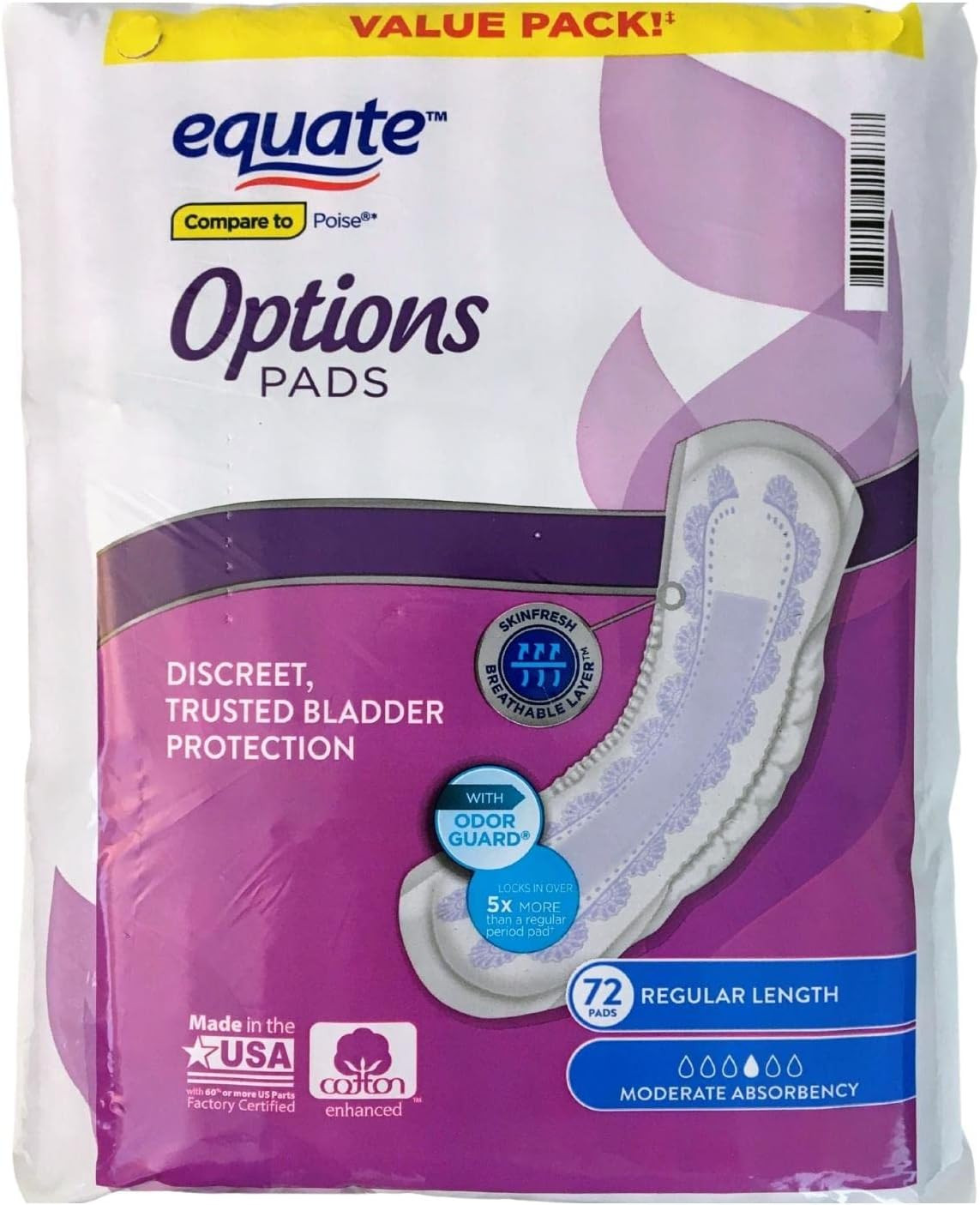 Equate Options Incontinence Pads Regular Length Bundle | Includes 72 Equate Options for Women, Moderate Absorbency | Plus Travel Wet Wipes!
