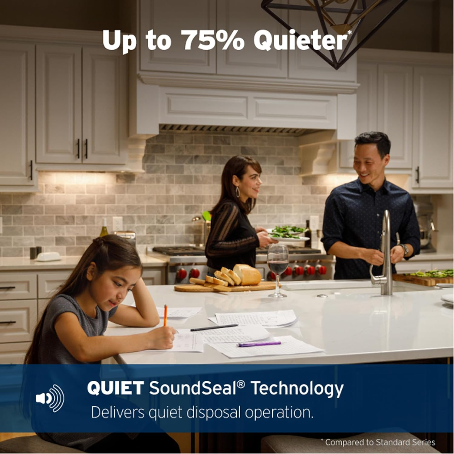 ADVANCED GRIND: Sink disposal with 3-Stage MultiGrind technology designed to prevent clogs by grinding tough food scraps the finest; 3/4 HP Dura-Drive induction motor and stainless steel grind components; removable Quiet Collar sink baffle