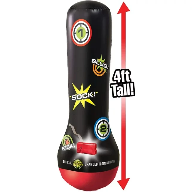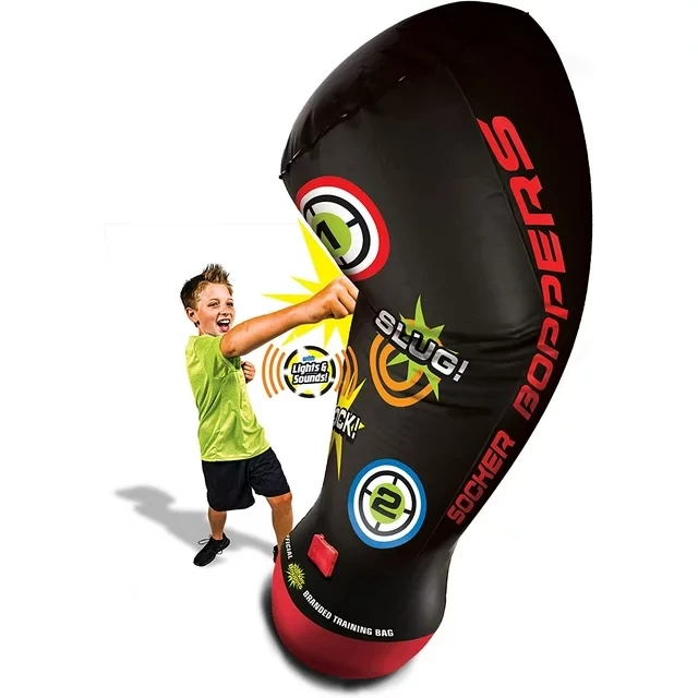 Bop the new socker Bopper electronic Bop bag, the bag that always bounces back! The world's fastest bounce-back action is water weighted & air-inflated for soft, safe fun! Sock, Wham, Bop! In this corner, measuring in at approximately 4 feet tall and weighing in around the same as a bucket of water We have the socker Bopper power bag from big time toys. And in this corner we have your child from your home getting ready to give it a whack. Your child can finally be like their favorite Super hero and learn all of the cool fighting tricks and moves. Best of all, it doesn't involve any actual fighting, and keeps score electronically with lights, sounds and digital display.